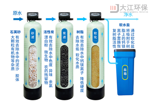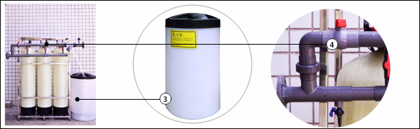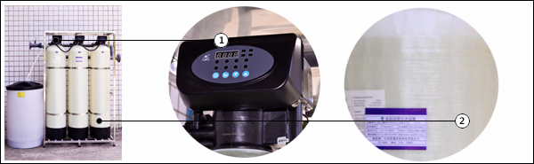 设备组成:微电脑主机控制器、玻璃钢树脂罐、加药盐箱、连接管件、软水盐、阳离子树脂。
